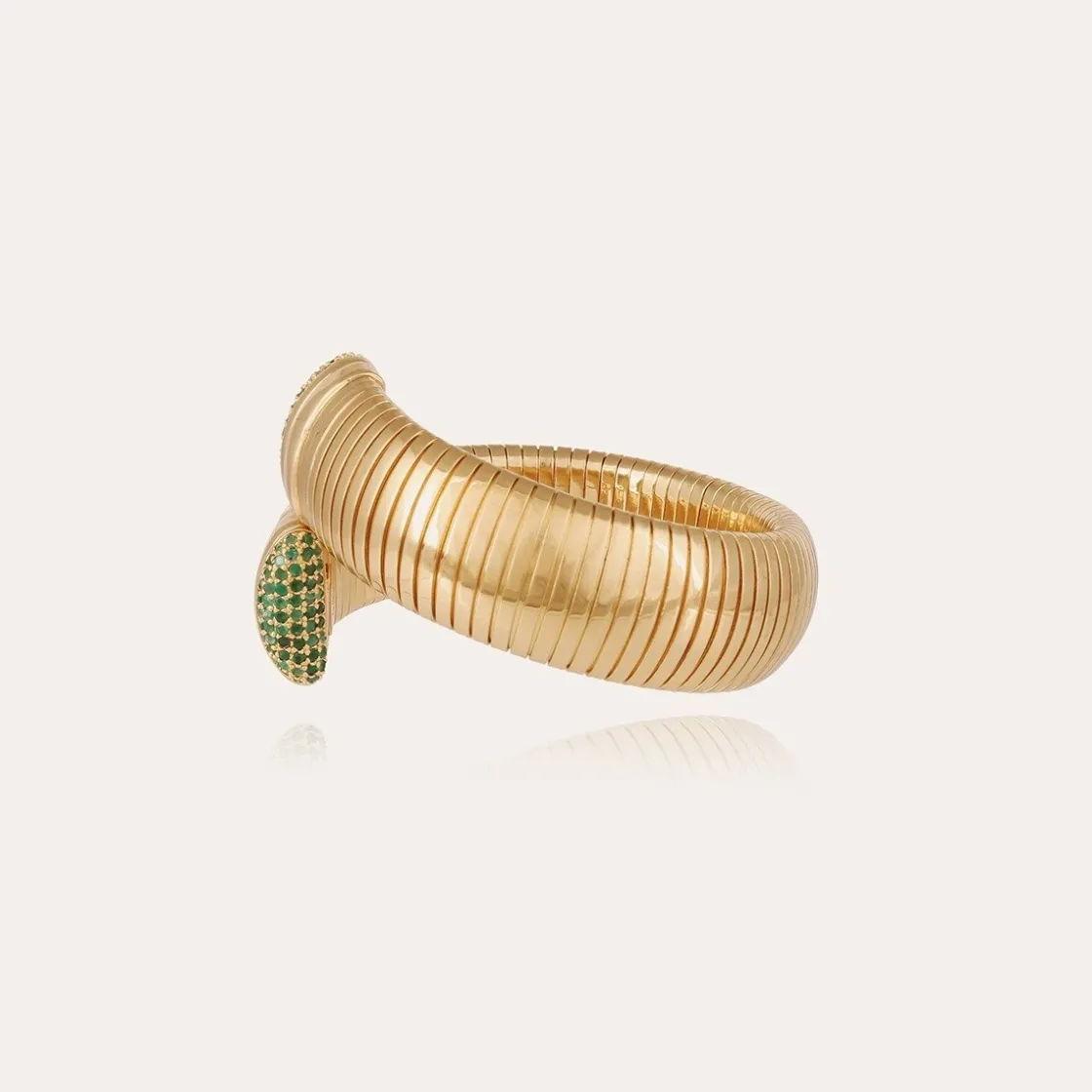 Gold plated bracelet featuring a slightly flexible mesh, with Emerald precious stones set in grain at the ends.