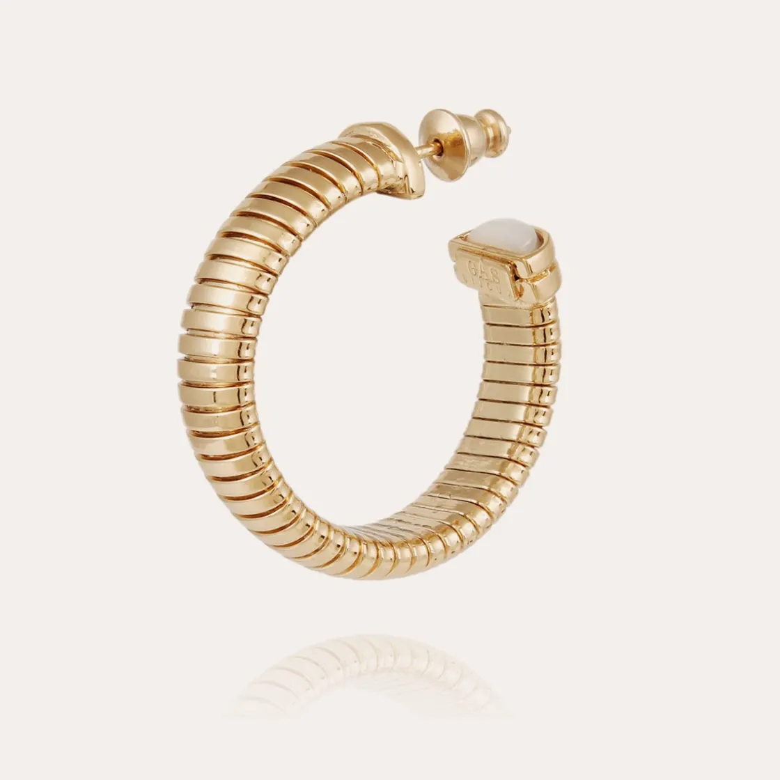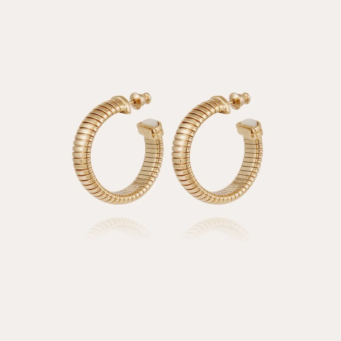 Gold plated hoop earrings, composed of a mesh adorned with have white Mother-of-pearl gemstones at ends.