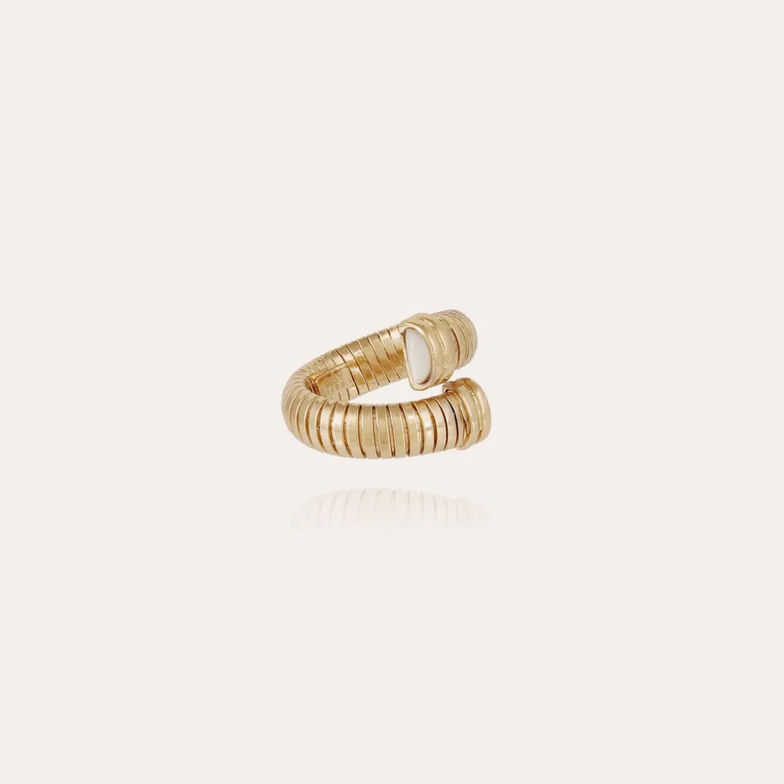 Gold plated ring composed of a flexible mesh adorned with gemstones (white Mother-of-pearl) cabochons. Adjustable size.