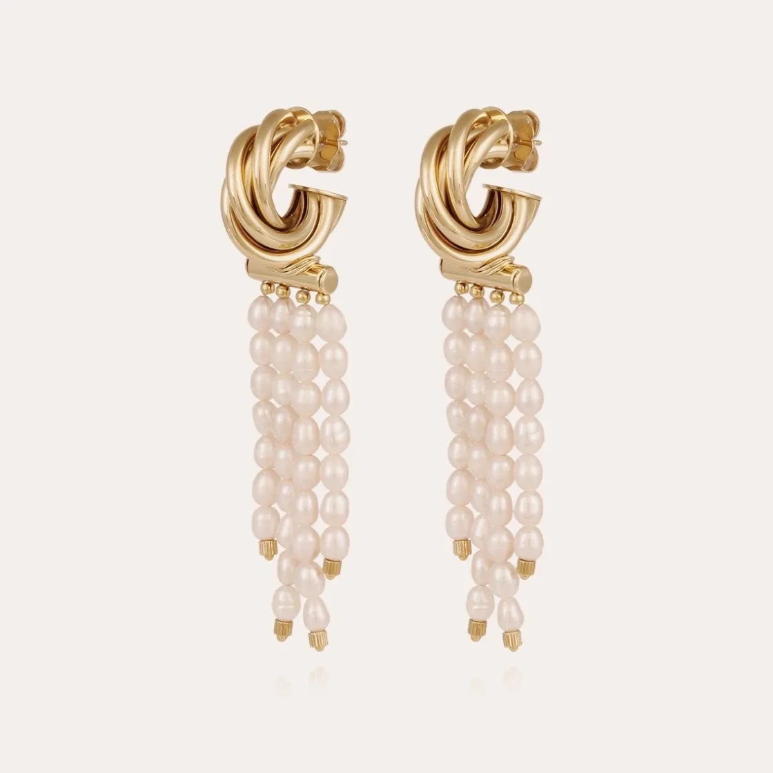 Gold plated earrings consisting of 6 rings superimposed and intertwined giving shape to a creole and embellished with cultured pearls.