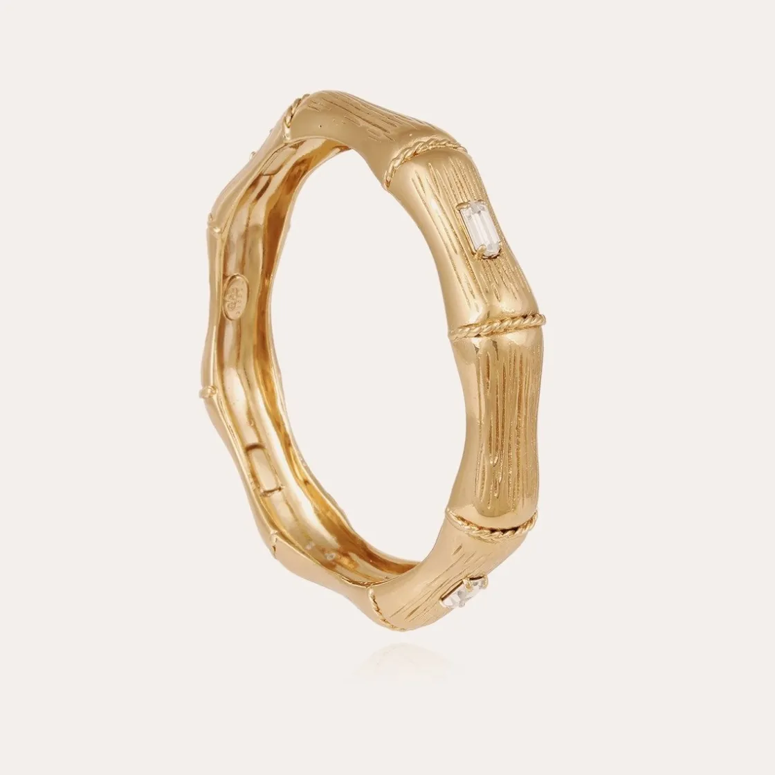 A fine gold-plated bangle bracelet, striated and embellished with ornamental hand-setting and delicate twisted bows.