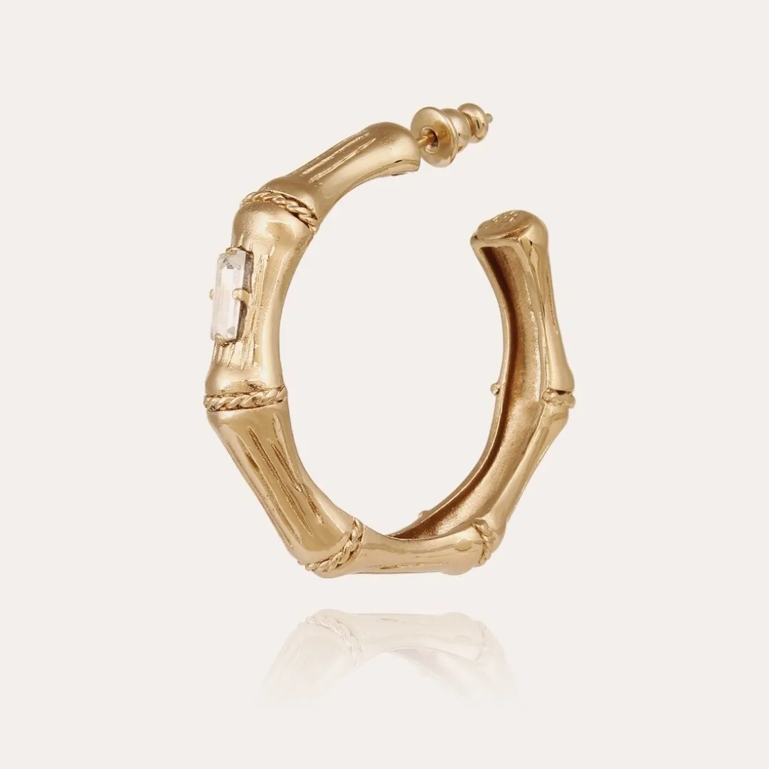 Gold-plated creole earrings, striated and embellished with ornamental hand-settings and delicate twisted bows.