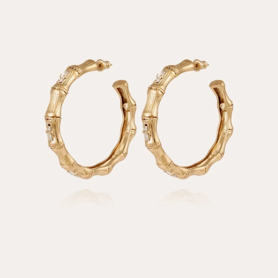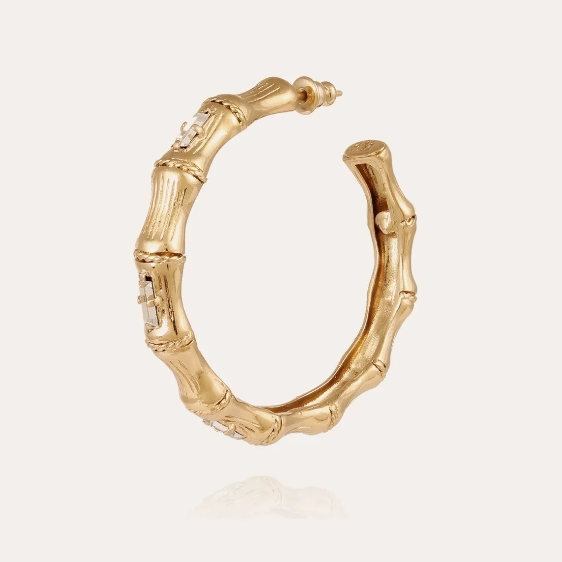 Gold-plated creole earrings, striated and embellished with ornamental hand-settings and delicate twisted bows.