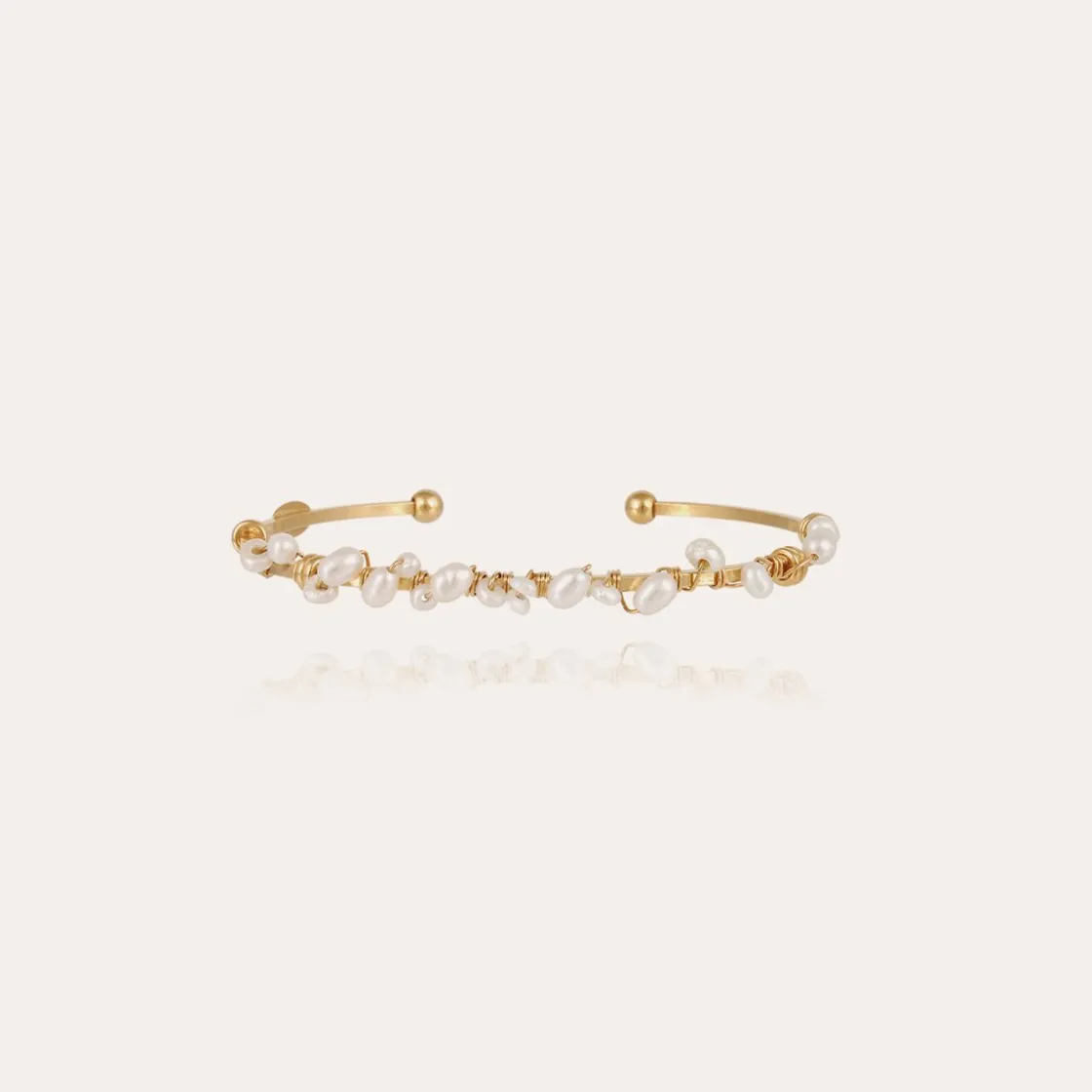 Gold plated bangle, delicately adorned with gemstones beads of white Mother-of-pearl. Adjustable size.