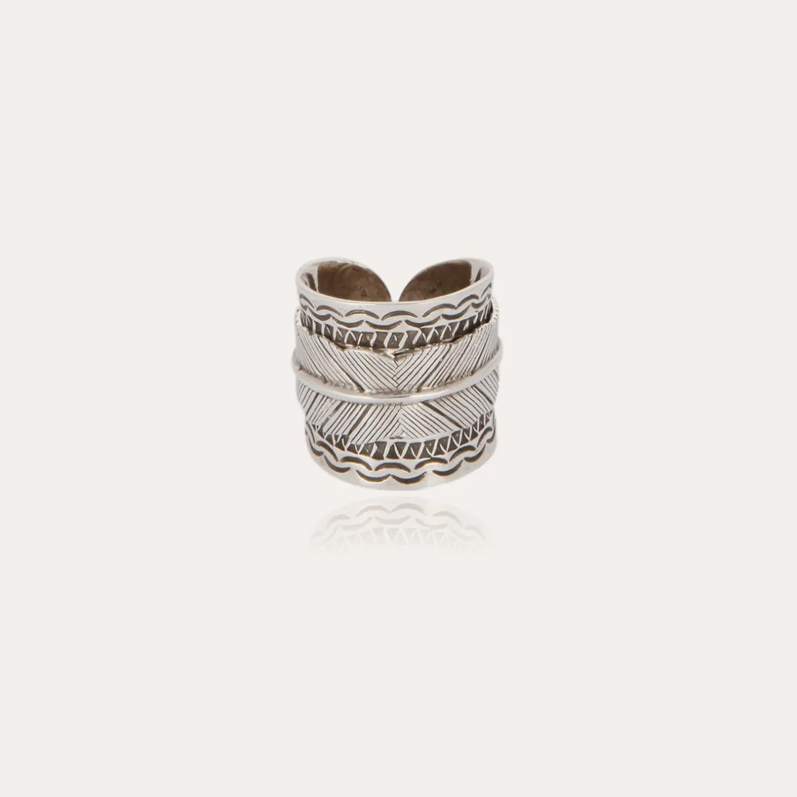 Silver plated ring finely engraved with volutes and embellished with a delicate feather. Adjustable size.