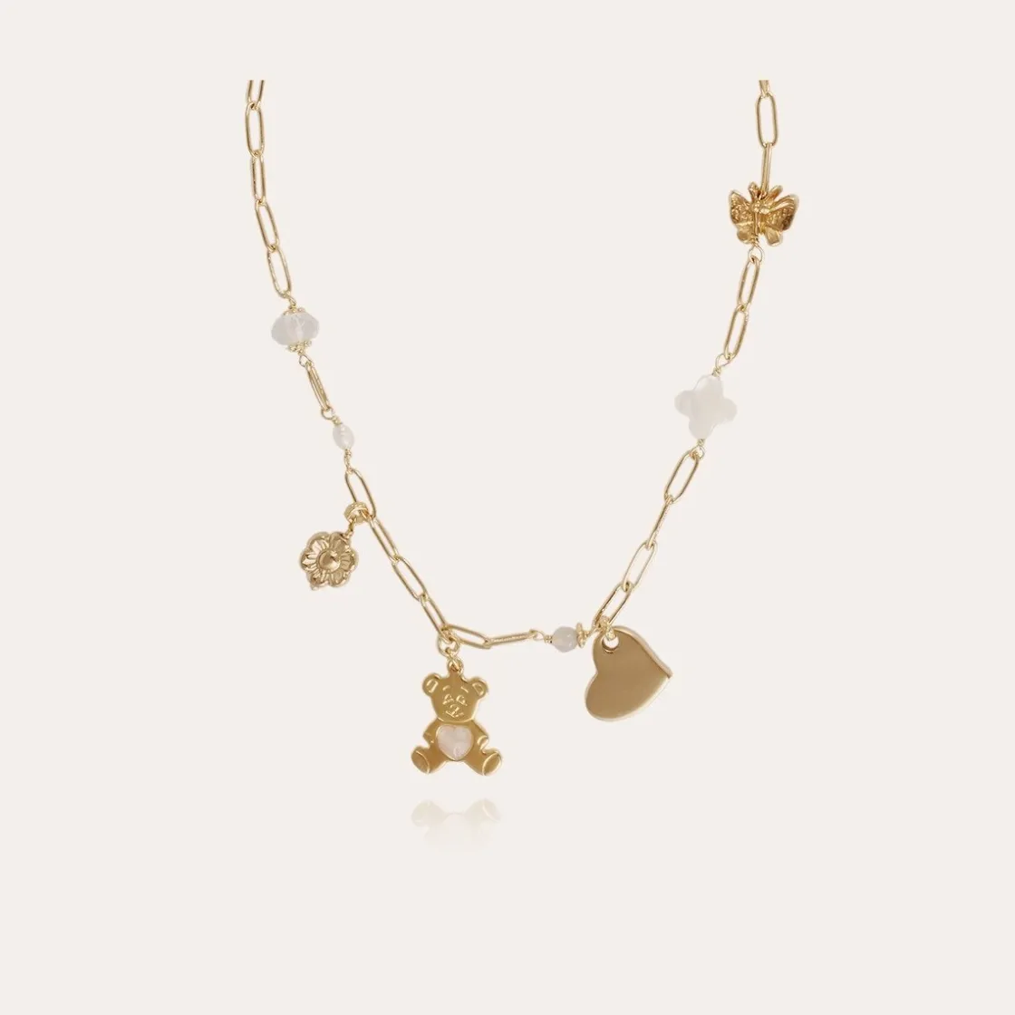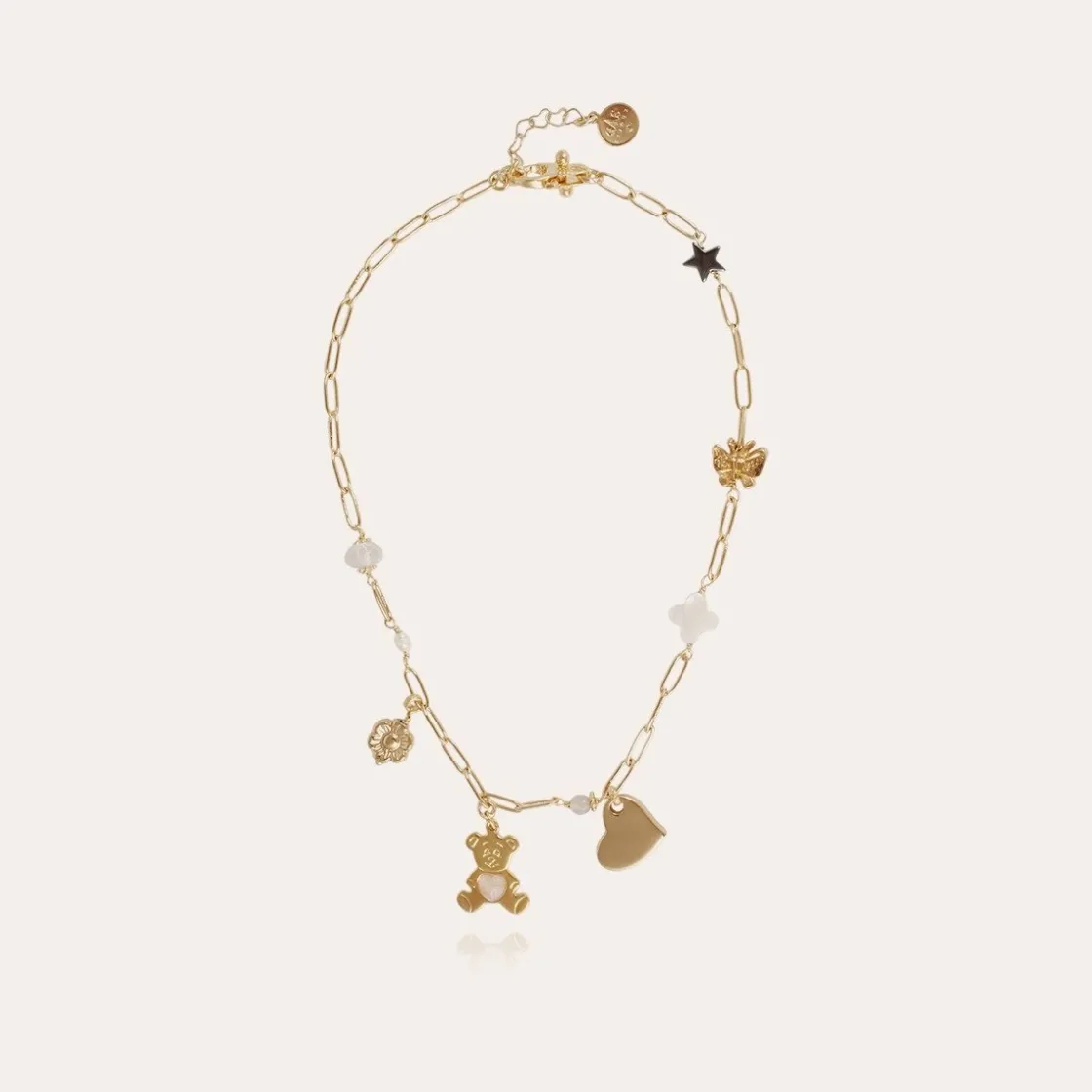 Necklace composed of a gold plated chain adorned with colored beads and charms. Adjustable length.