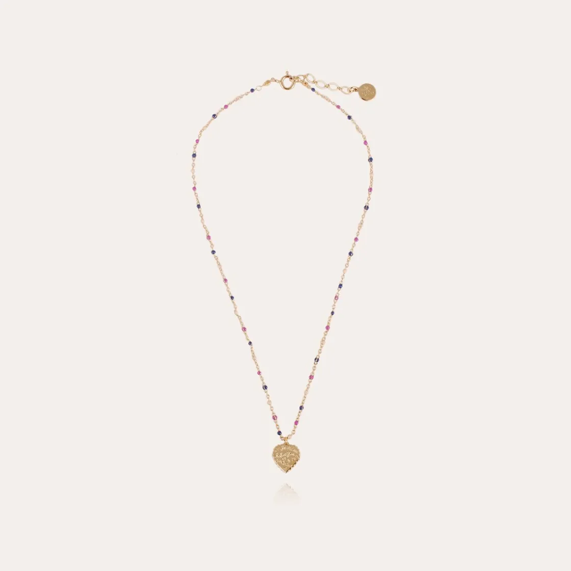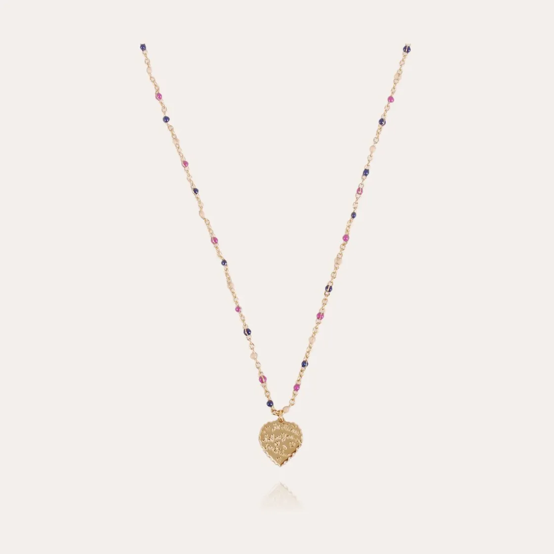 The « chic solaire » has no age. Gold plated necklace composed of a dainty chain adorned with a delicate heart-shaped medallion hand-engraved. Adjustable length.