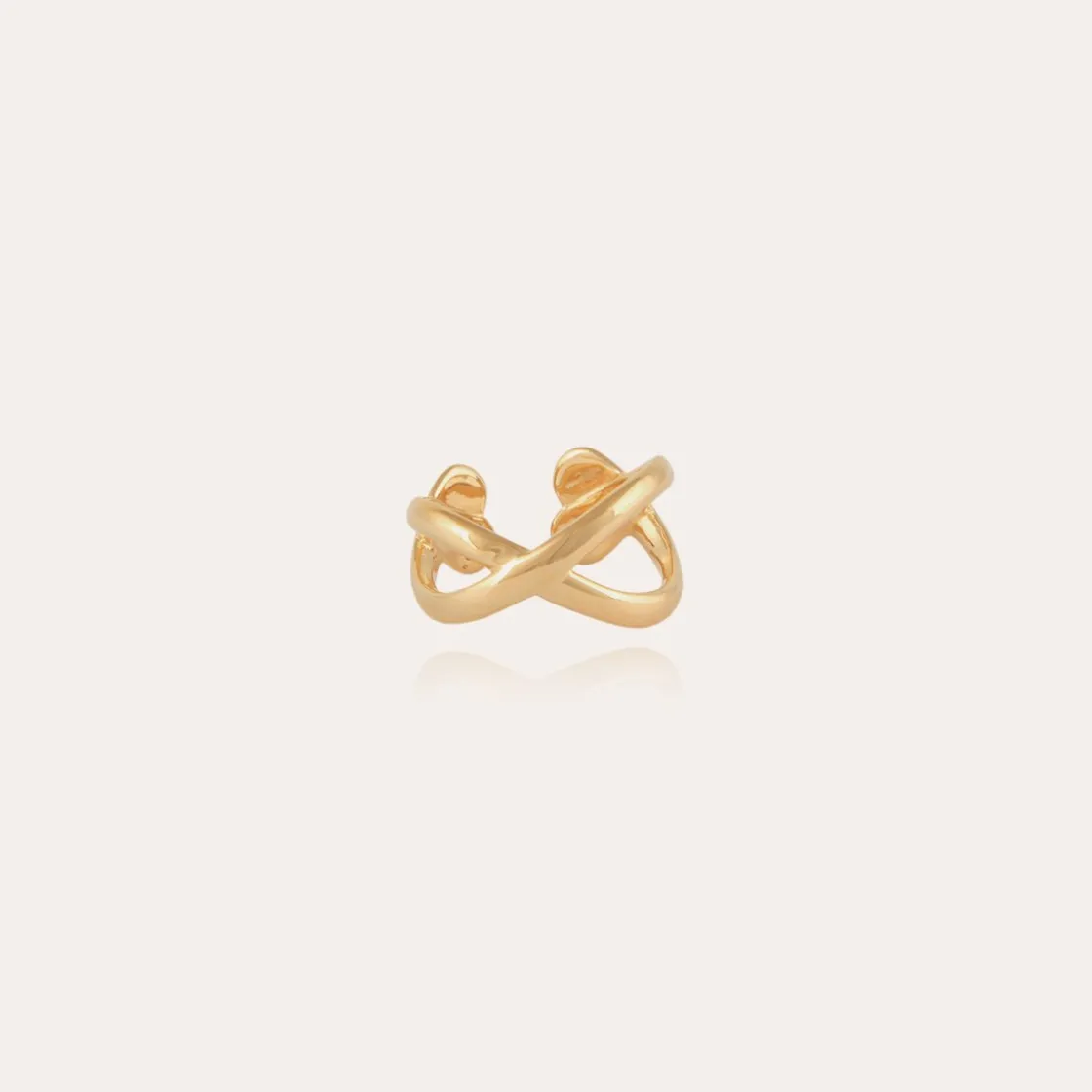 Gold plated ring composed of two bangles crossed in front. Adjustable size.
