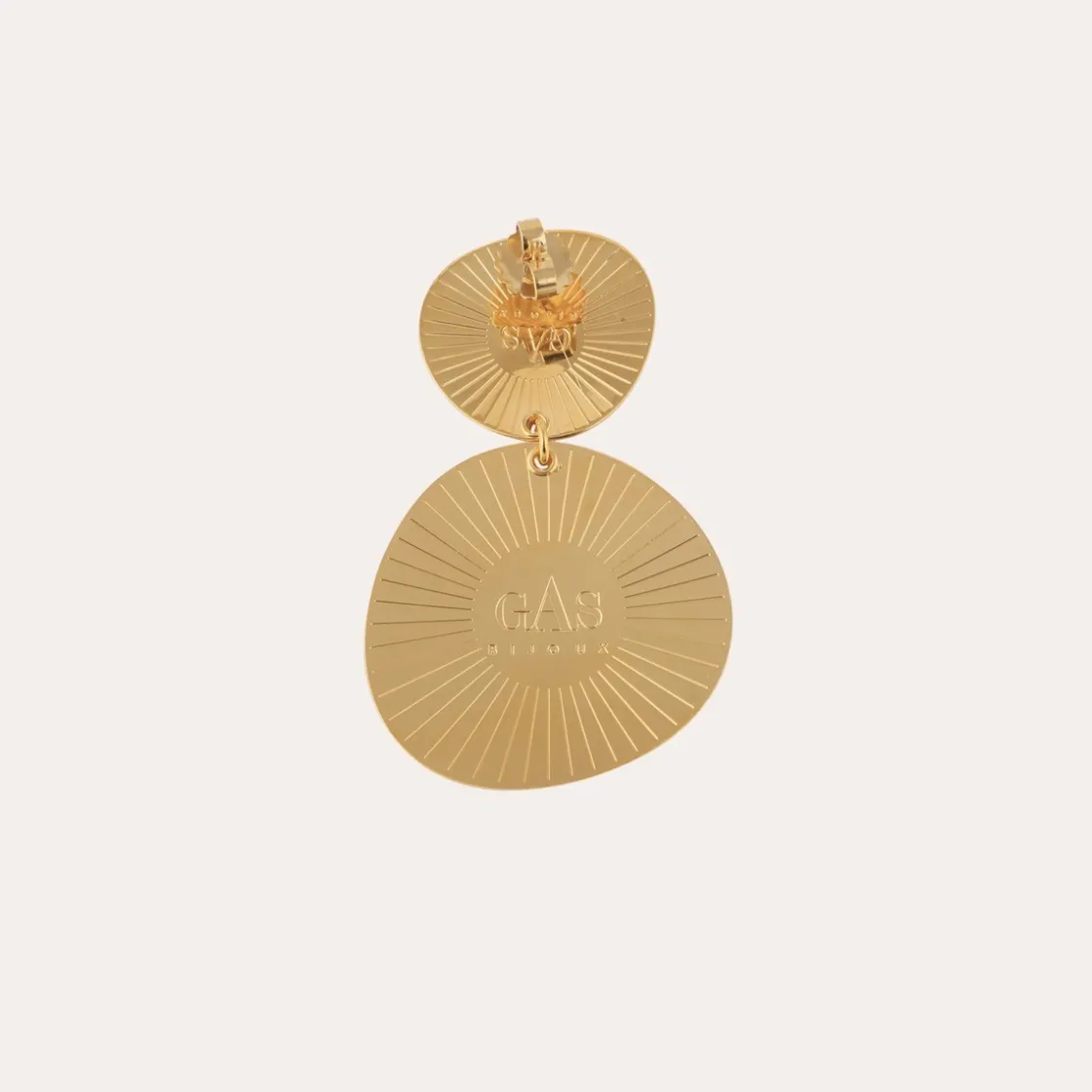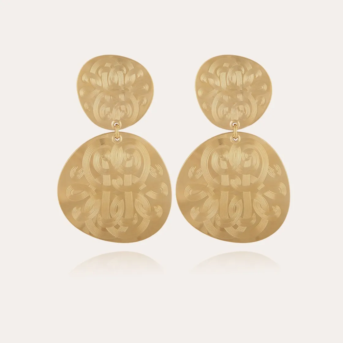 Gold plated earrings composed of two overlapping medallions, finely engraved with volutes.