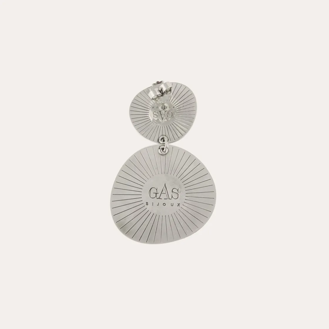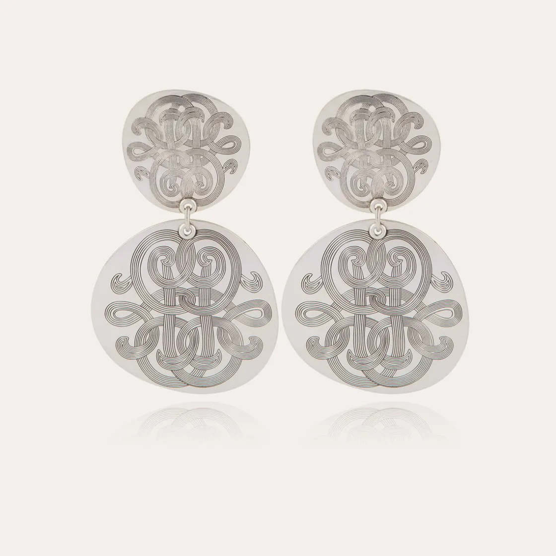 Silver plated earrings composed of two overlapping medallions, finely engraved with volutes.