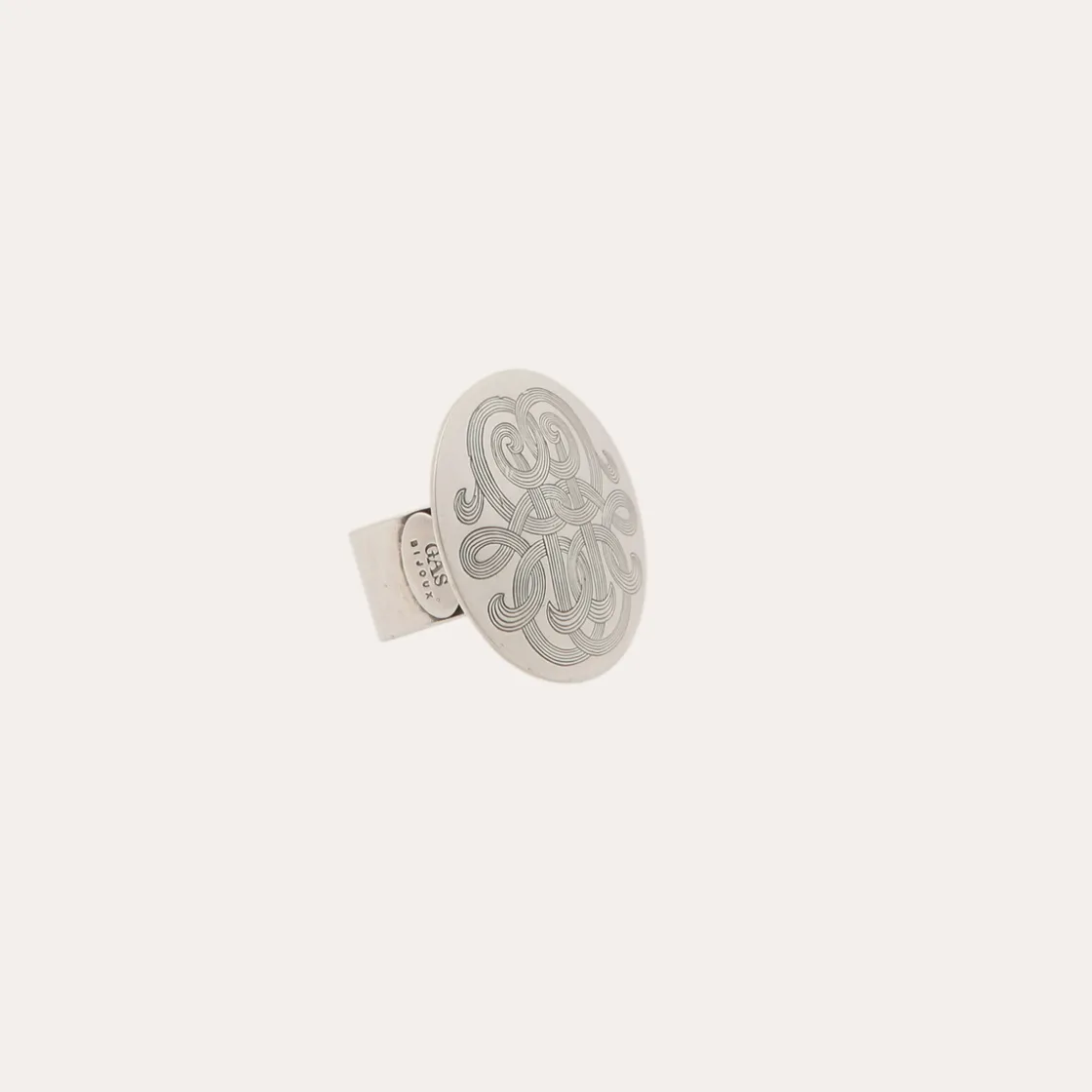 Silver plated ring adorned with a medallion delicately engraved with volutes. Adjustable size.