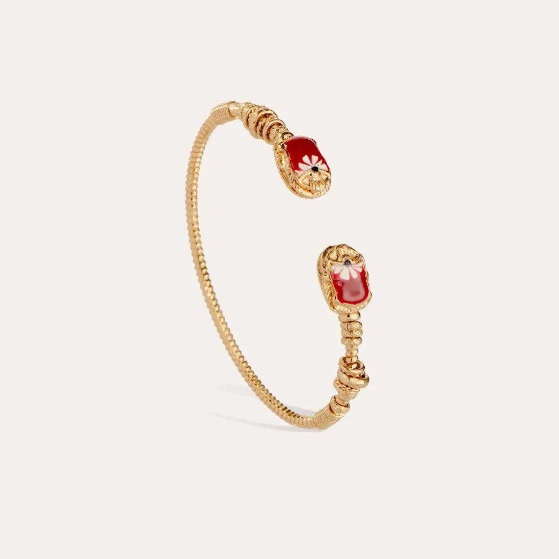 Gold plated twist bangle adorned with vintage rings and two enameled bettles. Adjustable size.