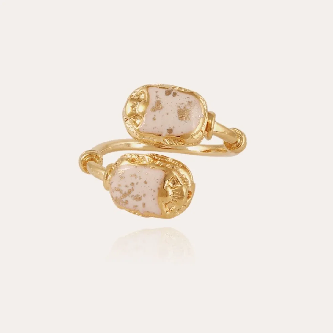 Gold plated ring, embellished with two beetles delicately engraved and enamelled. Adjustable size.