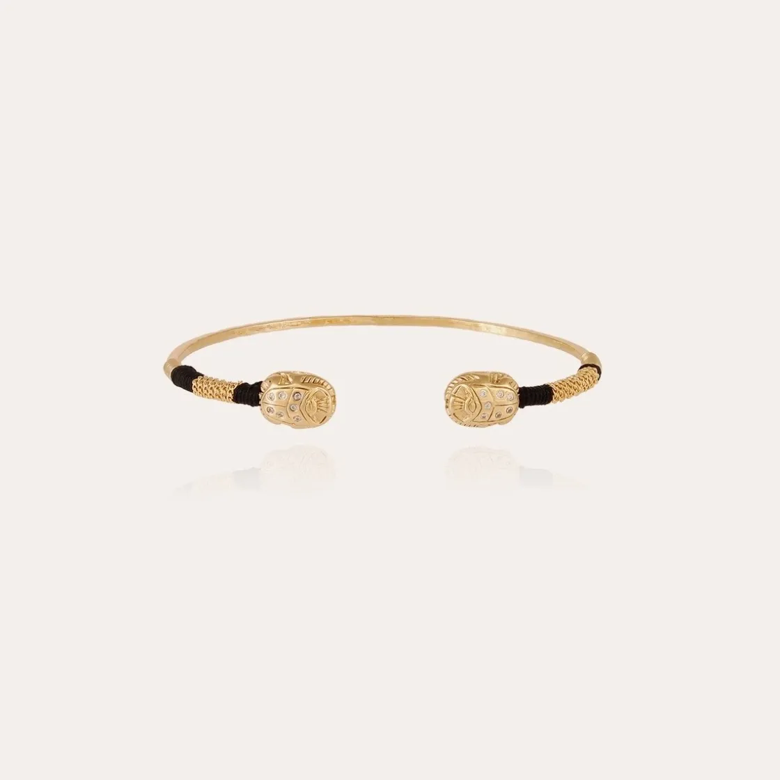 Gold-plated bracelet featuring two beetles set with zirconia. Adjustable size.