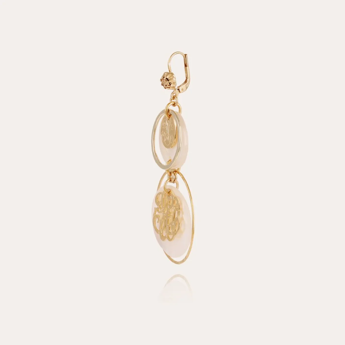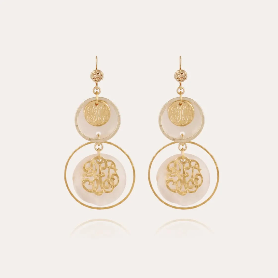 Gold plated earrings composed of a white Mother-of-pearl medallion and a silver filigree Gas Bijoux logo.