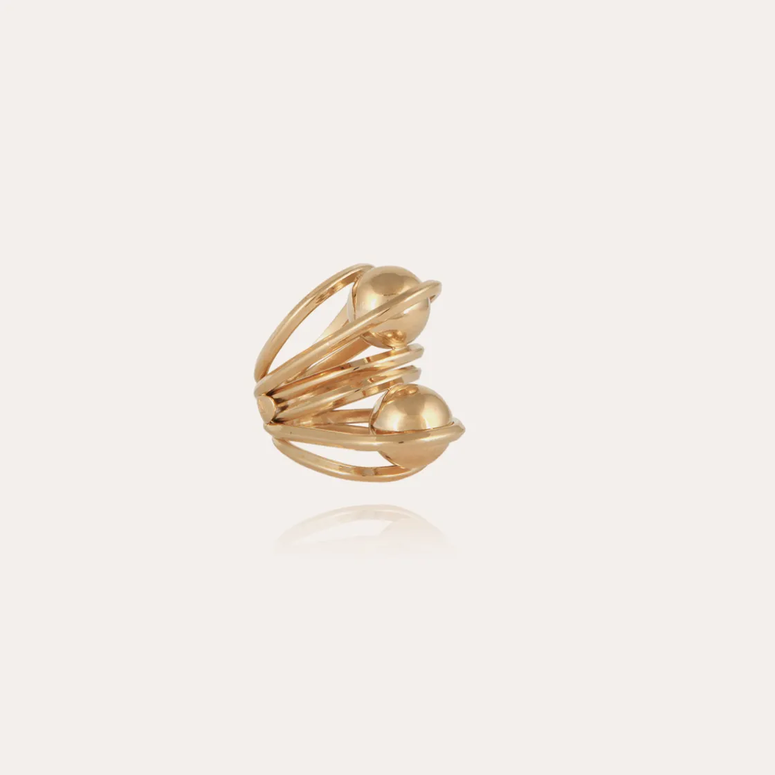 Jupiter ring Gas Bijoux x Françoise. This simple gold plated ring captures the delicacy of fine balls of various sizes. The balls are fixed. This piece was imagined by Johanna Senyk, designer of Françoise, and Marie Gas. Adjustable size.