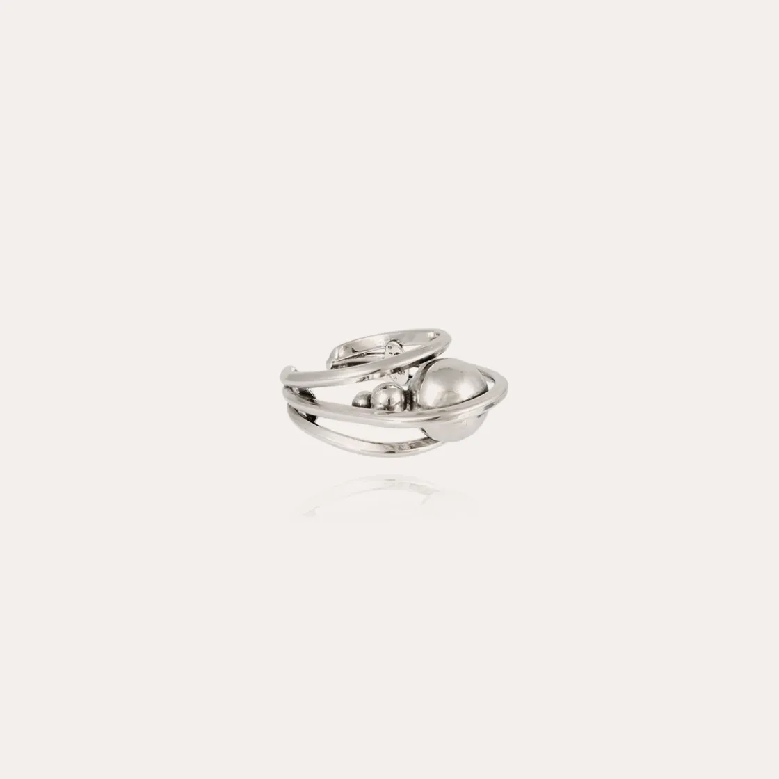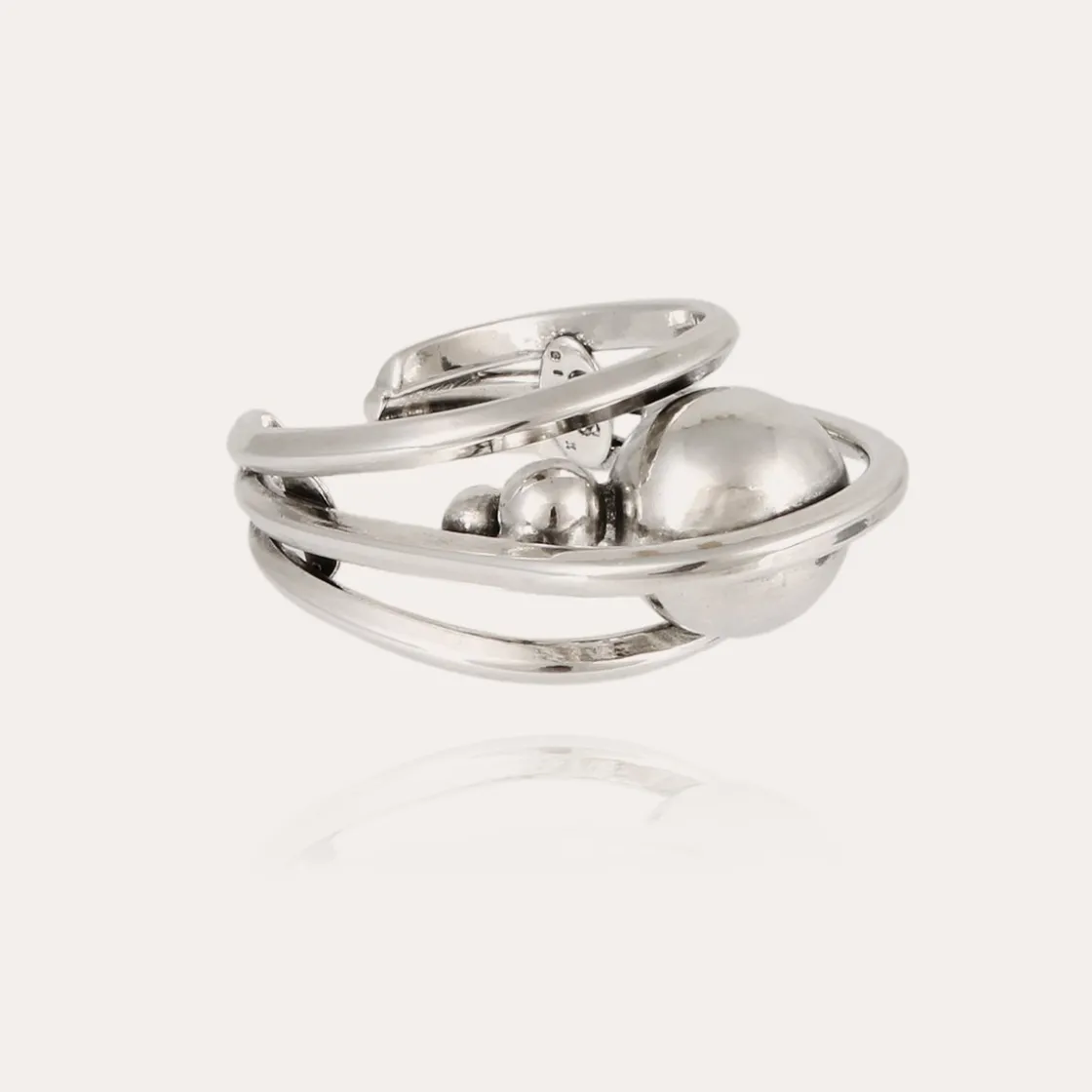 Jupiter ring Gas Bijoux x Françoise. This simple silver plated ring captures the delicacy of fine balls of various sizes. The balls are fixed. This piece was imagined by Johanna Senyk, designer of Françoise, and Marie Gas. Adjustable size.