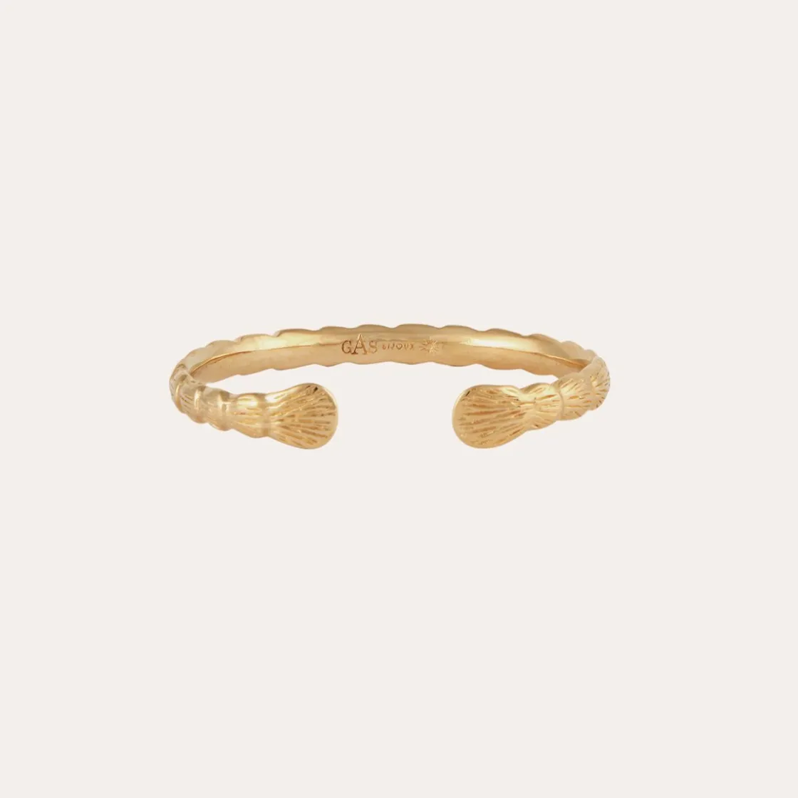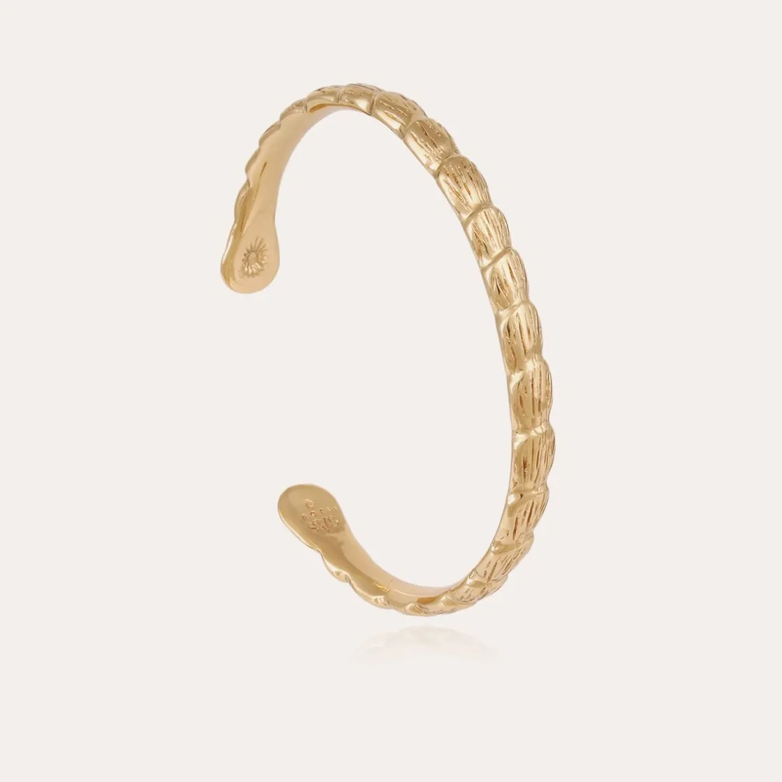 Gold plated and hand-hammered bangle bracelet. Adjustable size.