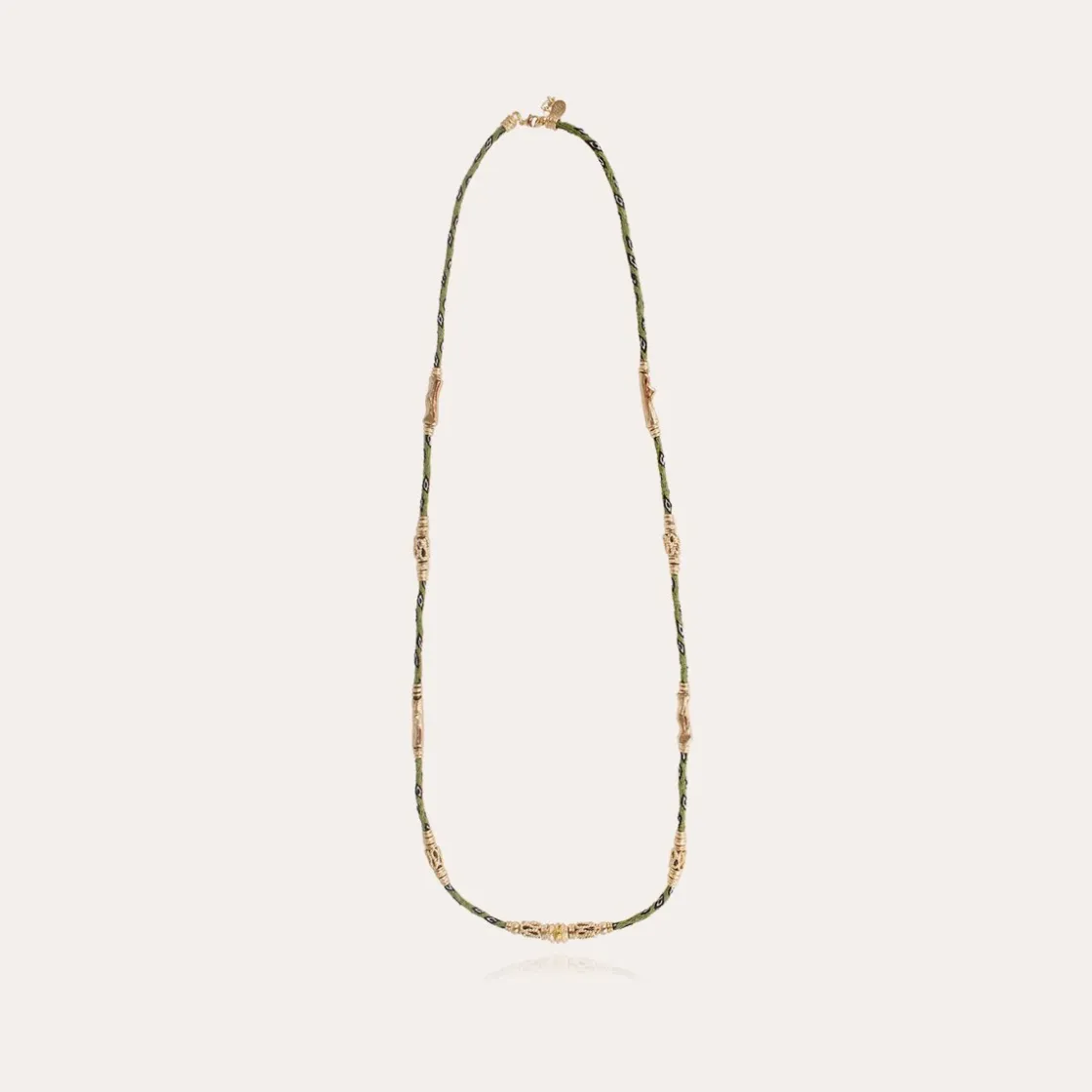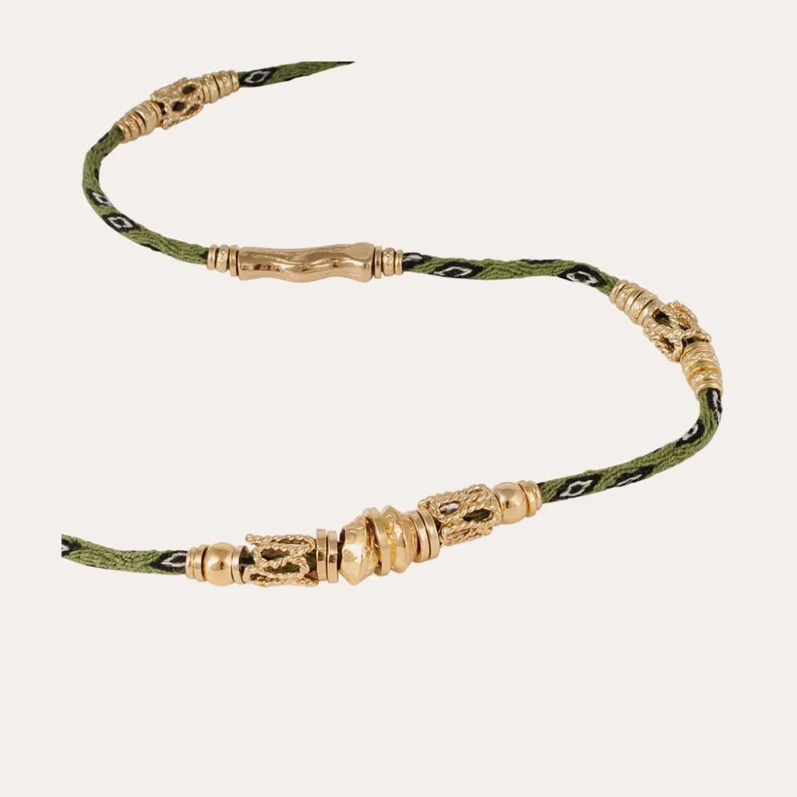 Long necklace made of hand-woven alpaca fiber, adorned with gilded metal ornaments.