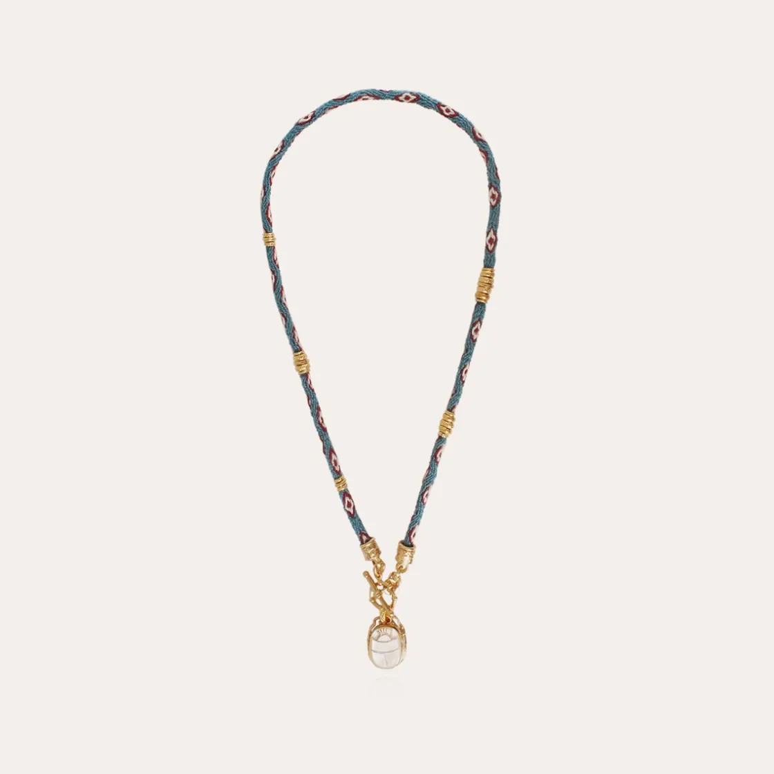 Necklace made of hand-woven alpaca fiber, adorned with gold plated ornaments and adorned with white Mother-of-pearl beetle pendant. Adjustable length.