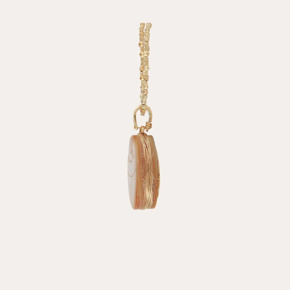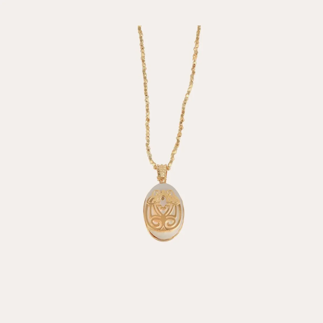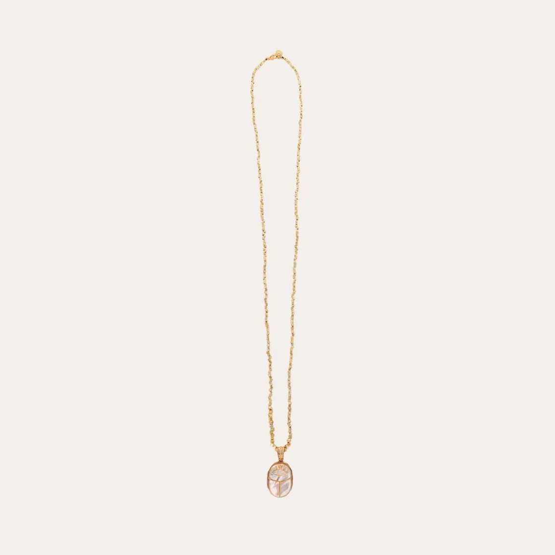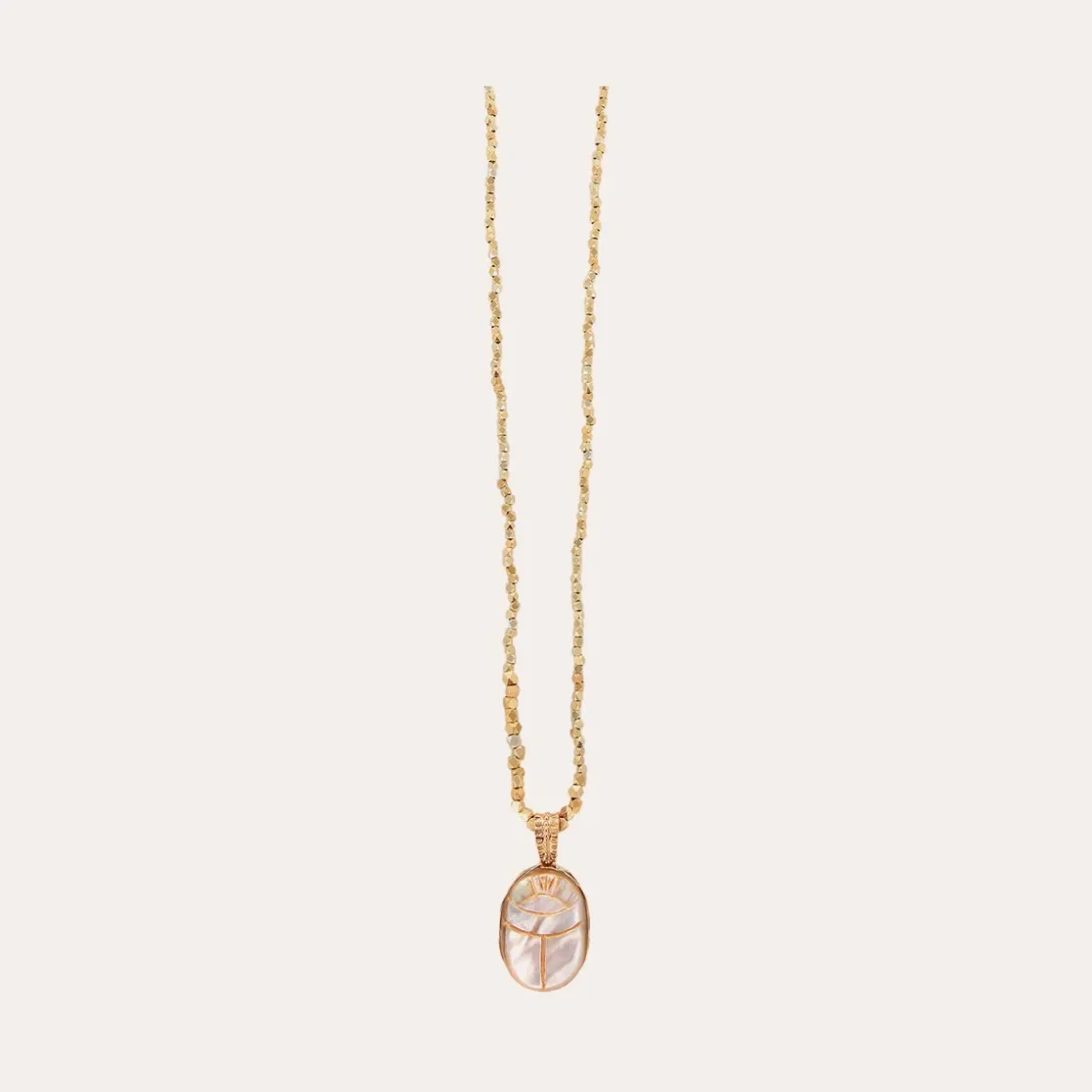 Gold plated long necklace made of handmade cut brass beads and adorned with a white mother-of-pearl beetle-shaped pendant.