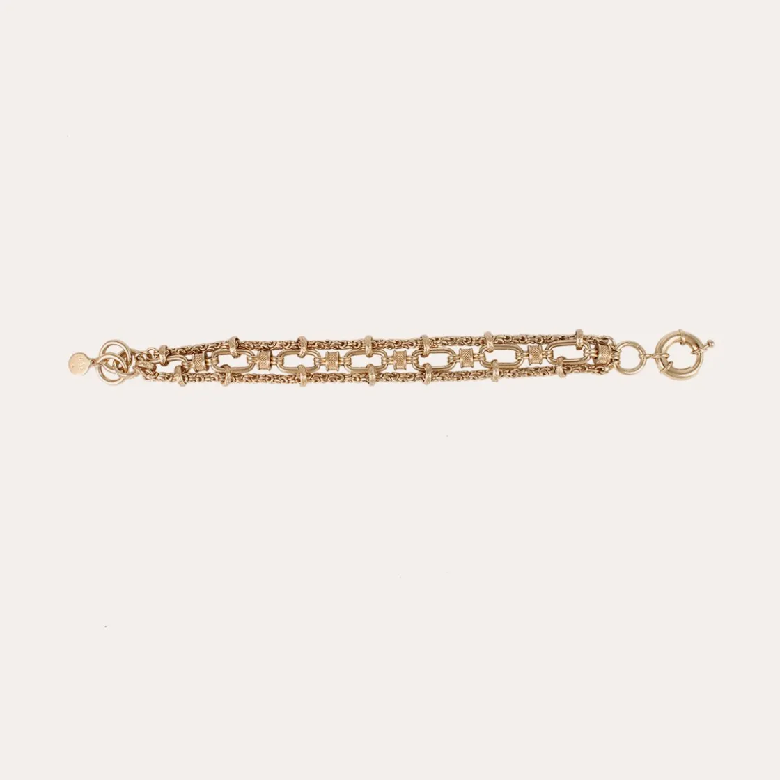 Gold plated bracelet composed with of three chains formed of multiple links.