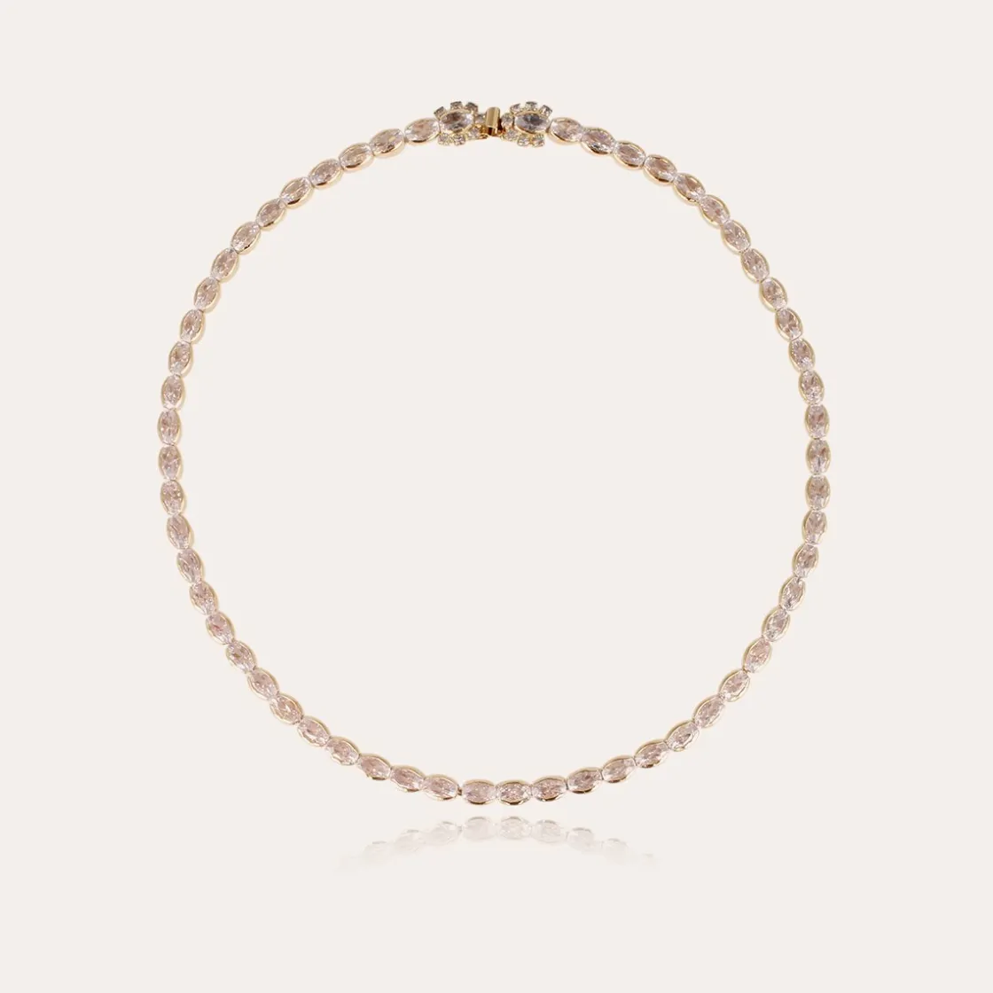 Gold plated necklace composed of elegant rhinestones with a flower clasp.
