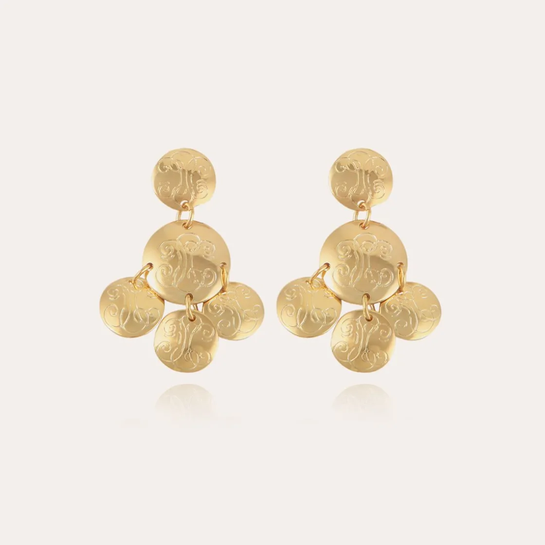 Gold plated earrings composed of medallions finely engraved with volutes.