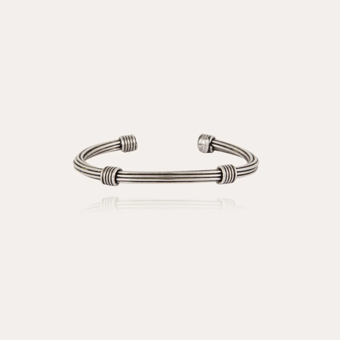 Silver plated bangle bracelet composed of metallic threads. Adjustable size.