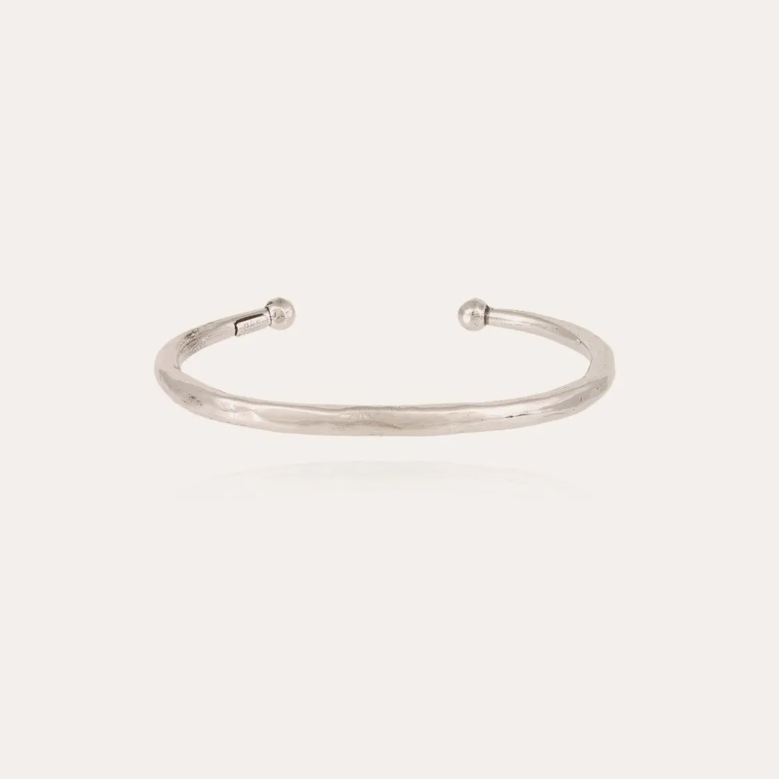 Silver-plated cuff hand-hammered embellished with hand-hammered balls. Adjustable size.