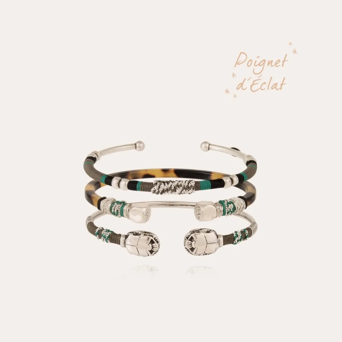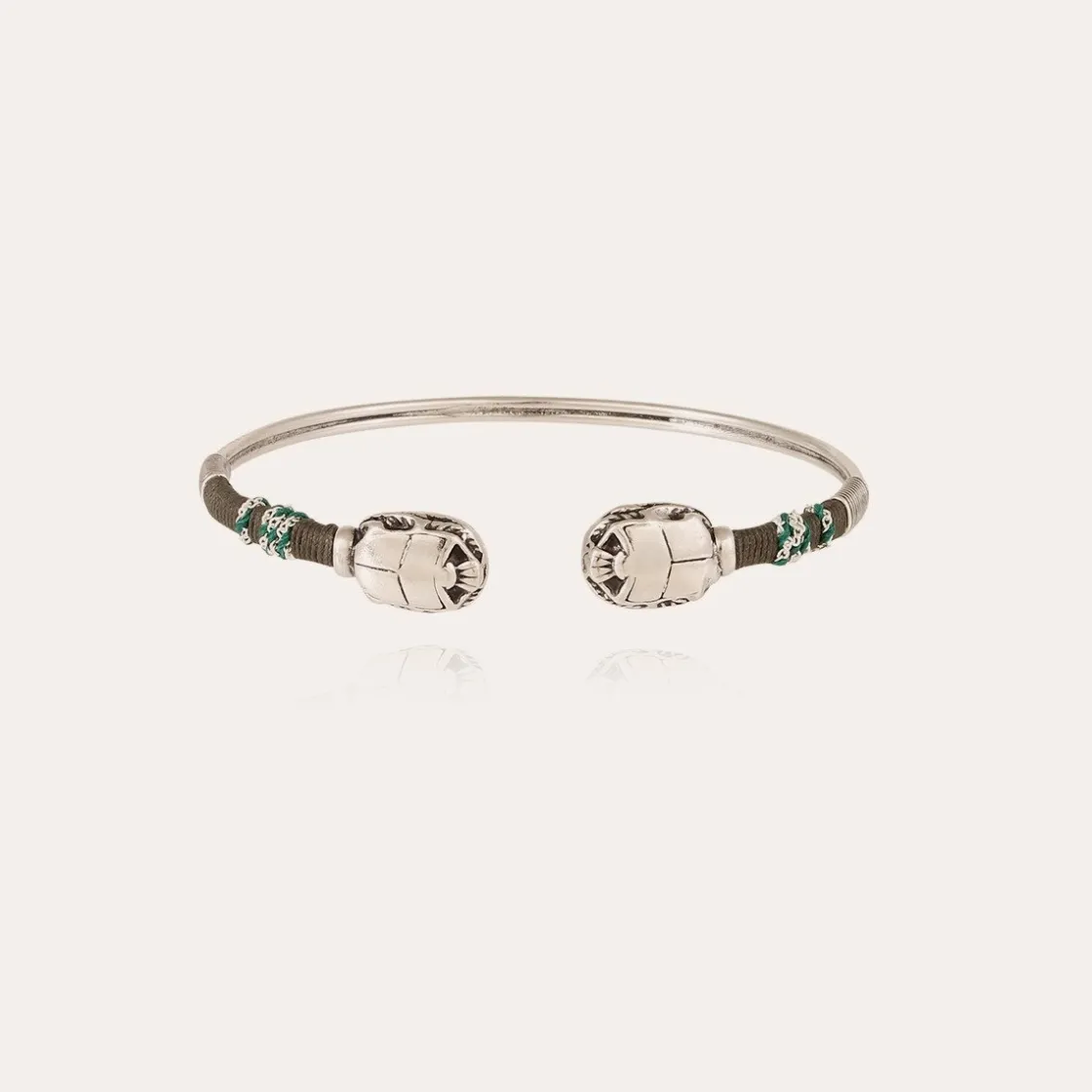 Silver plated cuff composed of two beetles, wrapped in part by chains and colored threads. Adjustable size.