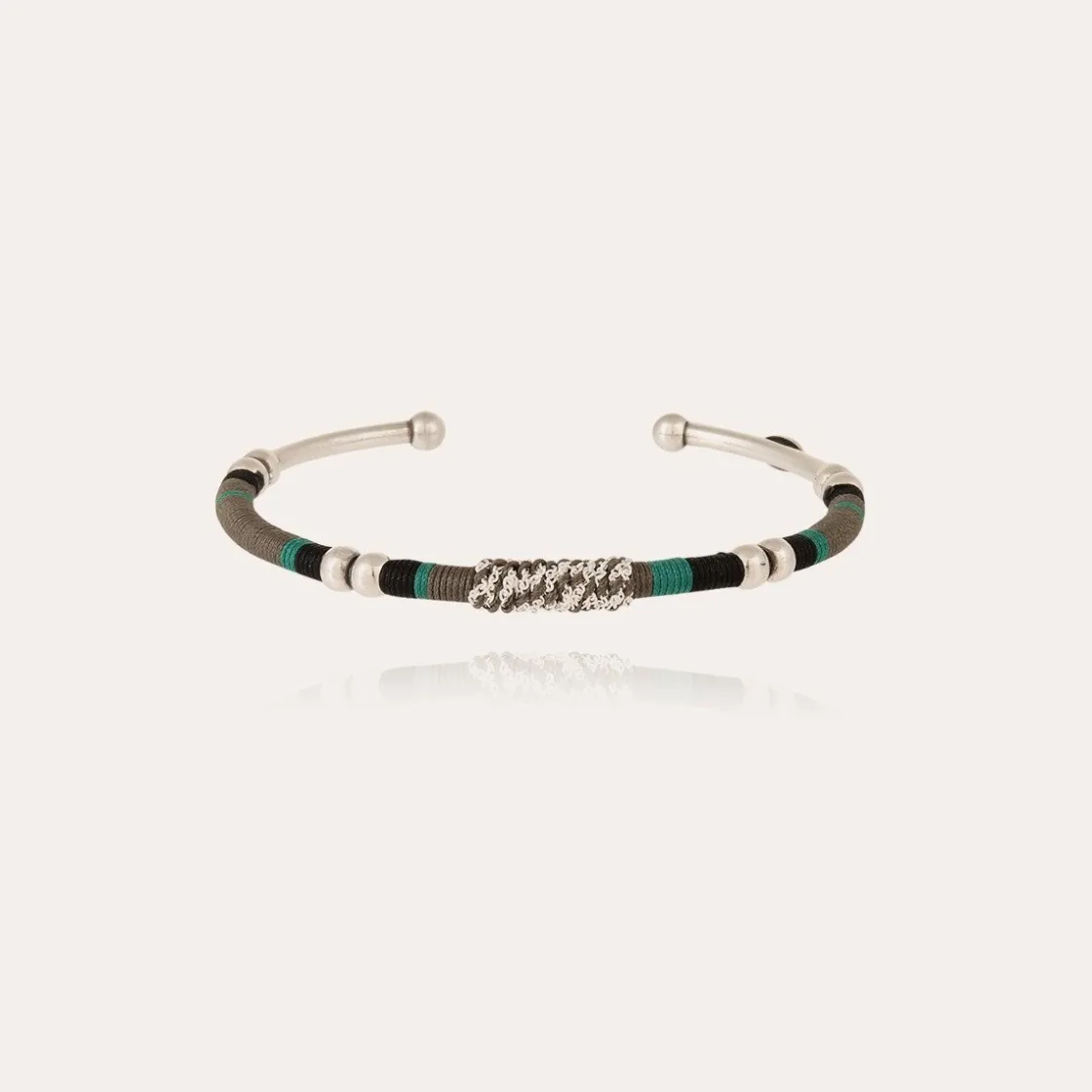 Acetate bangle wrapped in part with cotton threads and embellished with silver plated ends.