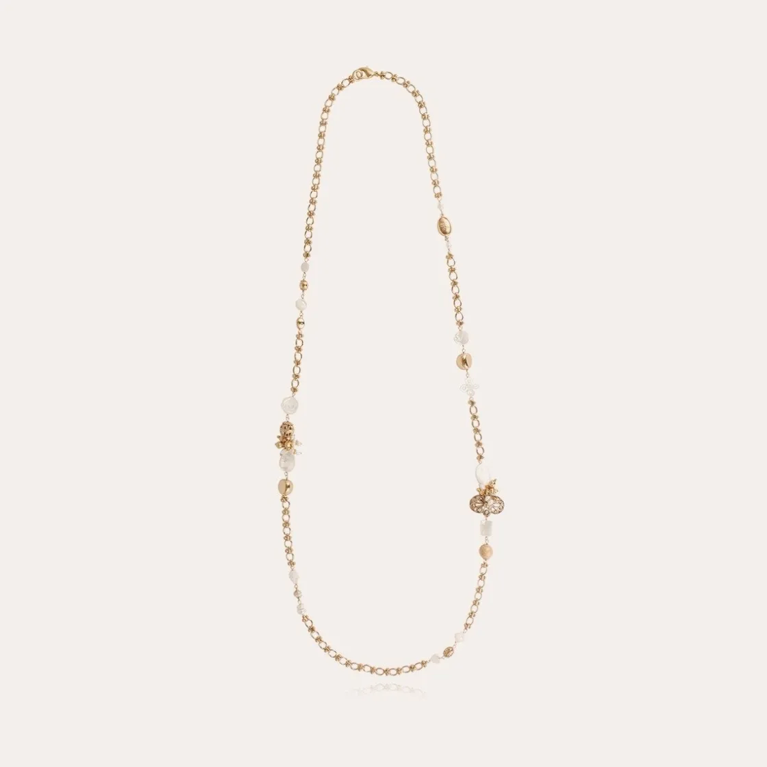 Gold plated long necklace adorned with white Mother-of-pearls, glass beads, pendants and gemstones. To be worn as a long necklace or doubled around the neck.